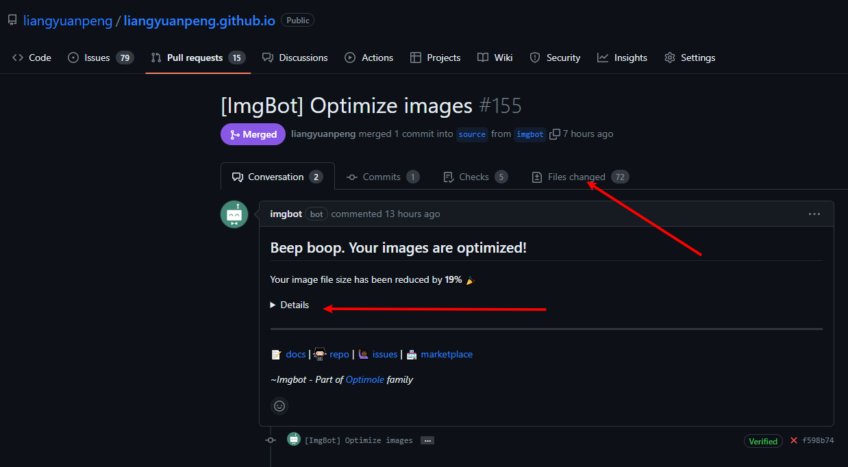 在有了 imgbot 这个图片优化神器,如果把时间线拉长就会知道总是需要手动去合并 imgbot 的 PR.