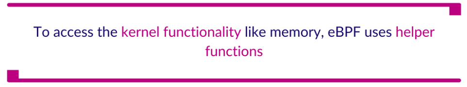 为了访问内核功能,如内存,eBPF 使用帮助程序函数。这些函数被保留下来,以为 eBPF 程序提供一种访问和修改内核函数的方式。在 eBPF 将程序附加到钩子后,为了使钩子执行程序,它依赖于帮助程序调用来执行访问内核的任务,就像 API 一样。帮助程序调用通常执行的任务包括网络数据包操作、生成随机数、访问数据和时间、访问套接字数据、执行尾调用等。